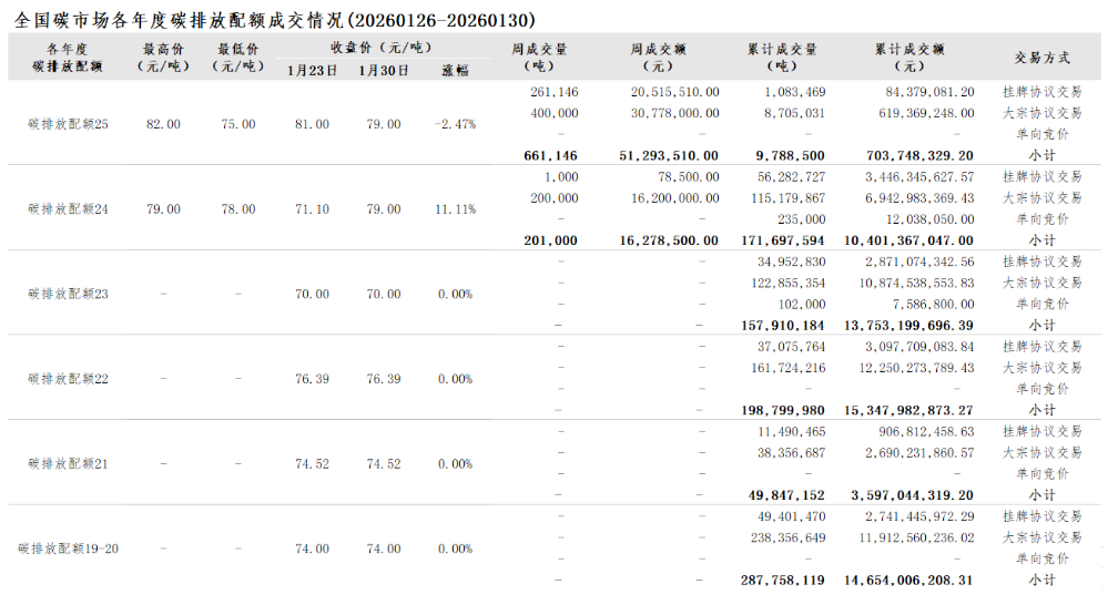 2026年1月1日至1月30日,全国碳市场碳排放配额成交量10,935,009吨,成交额794,730,241.80元。