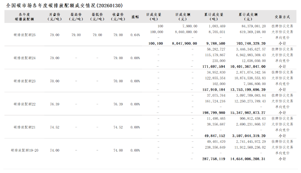 2026年1月1日至1月30日,全国碳市场碳排放配额成交量10,935,009吨,成交额794,730,241.80元。