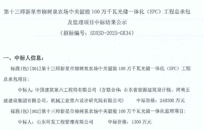 2月7日,新疆兵团第十三师新星市柳树泉农场中关韶能100万千瓦光储一体化(EPC)工程总承包及监理项目中标结果公示。