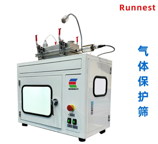 气体保护筛,是针对在筛分过程中有些物料不能与空气接触,否则就会发生氧化或爆炸。所以在筛分过程中,筛机、料仓、收料斗呈完全密封状态,同时需要充入惰性气体保护。筛分前对筛机、接料仓,管道内进行气体置换,氧含量低于设定值后,方可进行投料生产。启动旋振筛,同时打开超声波电源,打开放料阀,物料匀速投入超声波振动筛,进行精细筛分。