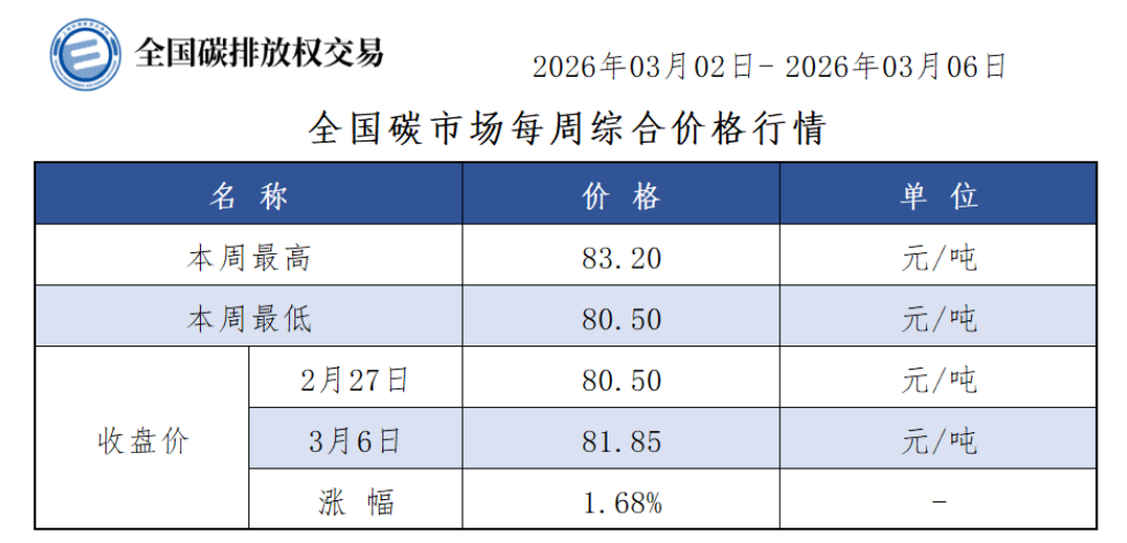 本周全国碳市场综合价格行情为:最高价83.20元/吨,最低价80.50元/吨,收盘价较上周五上涨1.68%。