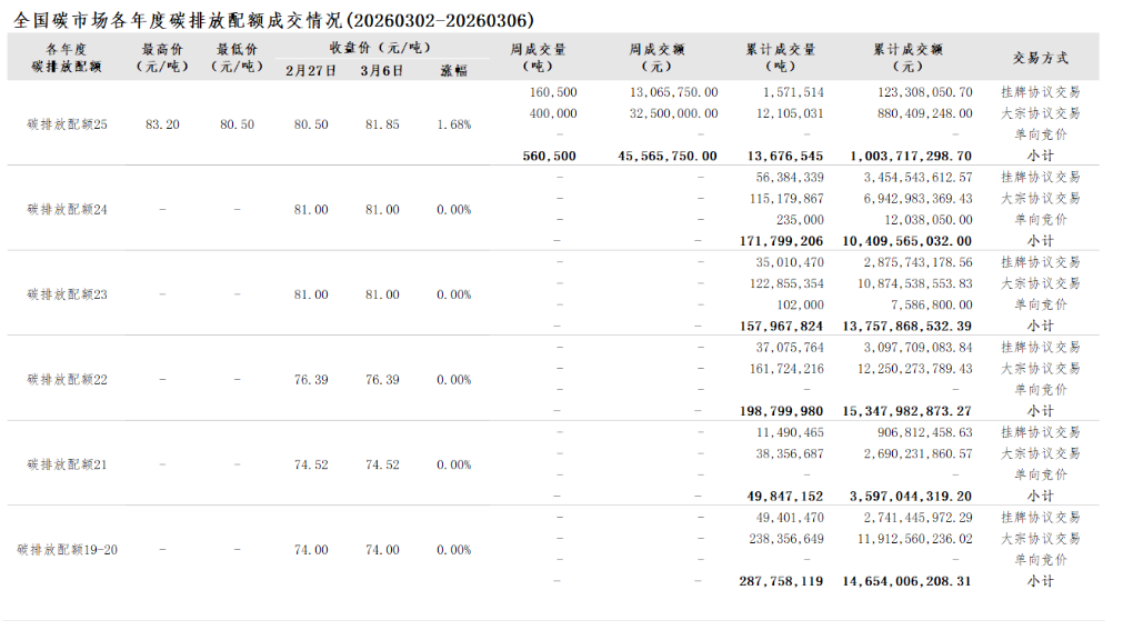 2026年1月1日至3月6日,全国碳市场碳排放配额成交量14,982,306吨,成交额1,107,566,032.30元。