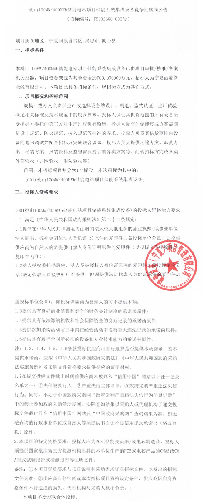 北极星储能网讯:2026年3月4日,宁夏桃山100MW/400MWh储能电站项目储能系统集成设备竞争性磋商公告,采购一批储能系统设备。项目资金来源为其他资金20000万元,合单价0.5元/Wh。是该项目启动的第二次招标。