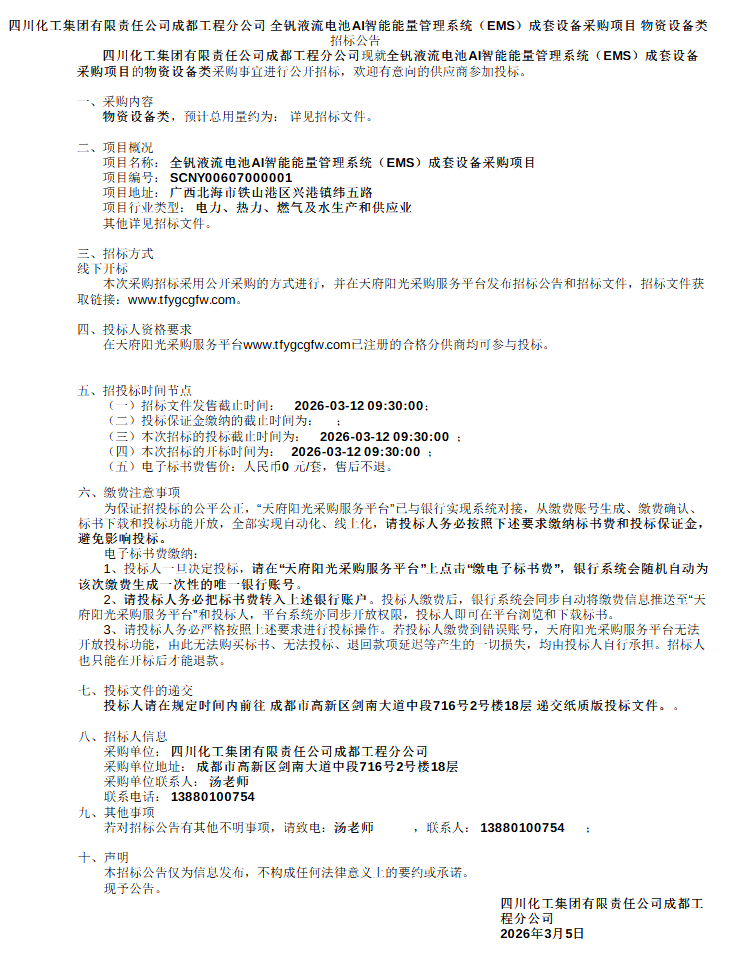 北极星储能网获悉,3月5日,四川化工集团成都工程分公司发布招标公告,拟采购全钒液流电池AI智能能量管理系统(EMS)成套设备。