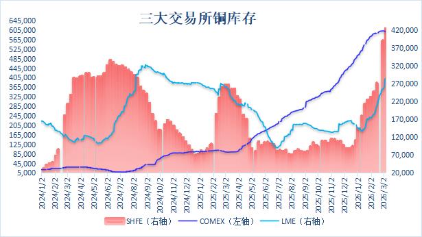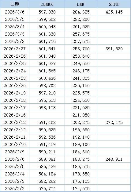 以下为2026年2月以来三大交易所铜库存数据:(单位:吨)
