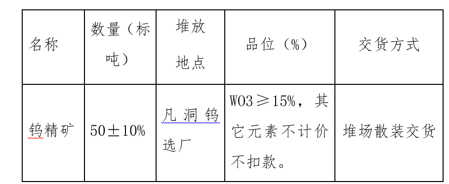 二、竞价后我公司只对含钨和水份进行检测,其他元素指标不作检测。同时,中标单位需在提货前足额支付钨精矿货款。