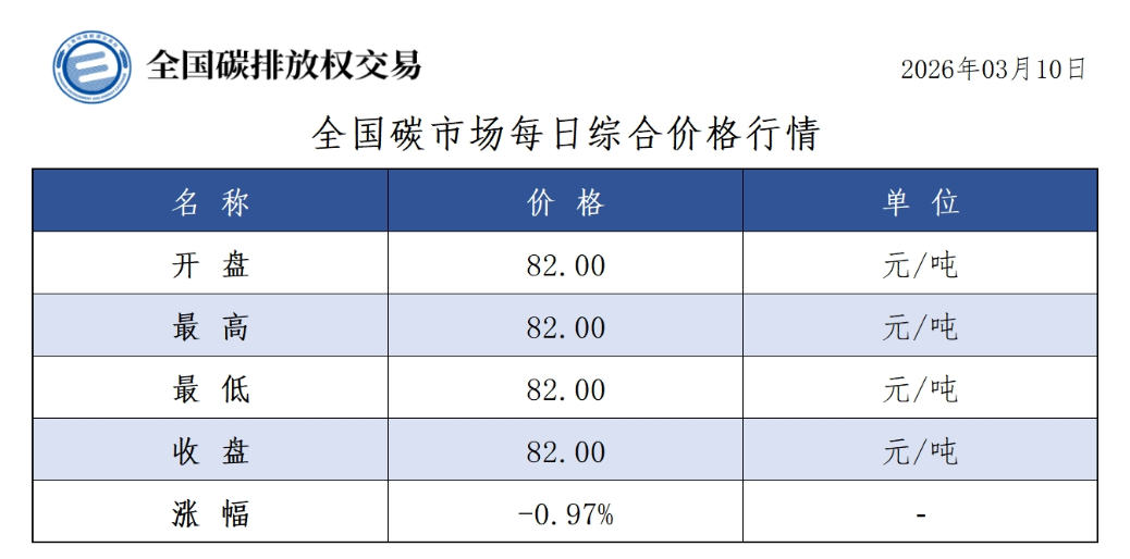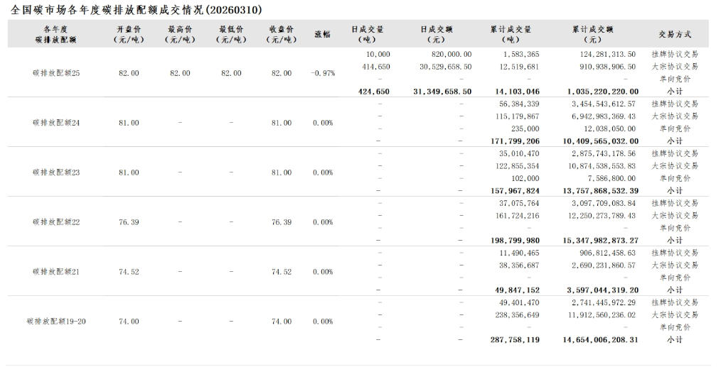 2026年1月1日至3月10日,全国碳市场碳排放配额成交量15,408,807吨,成交额1,139,068,953.60元。