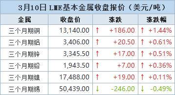 伦敦时间3月10日17:00(北京时间3月11日01:00),LME三个月期铝上涨20.5美元,或0.61%,收报每吨3,406.0美元。