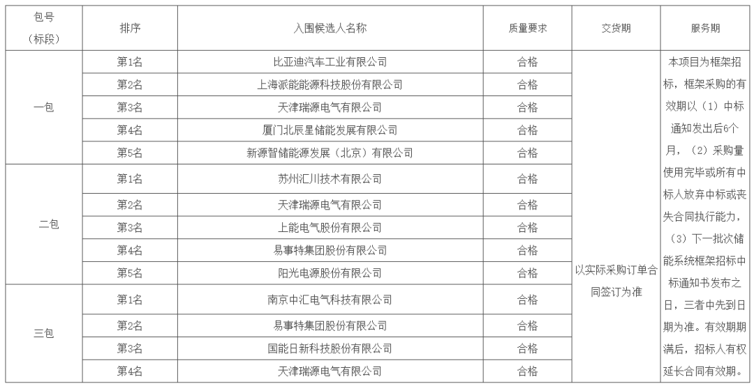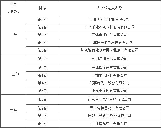 标段一中标候选人前五名依次为比亚迪汽车工业有限公司、上海派能能源科技股份有限公司、天津瑞源电气有限公司、厦门北辰星储能发展有限公司、新源智储能源发展(北京)有限公司;