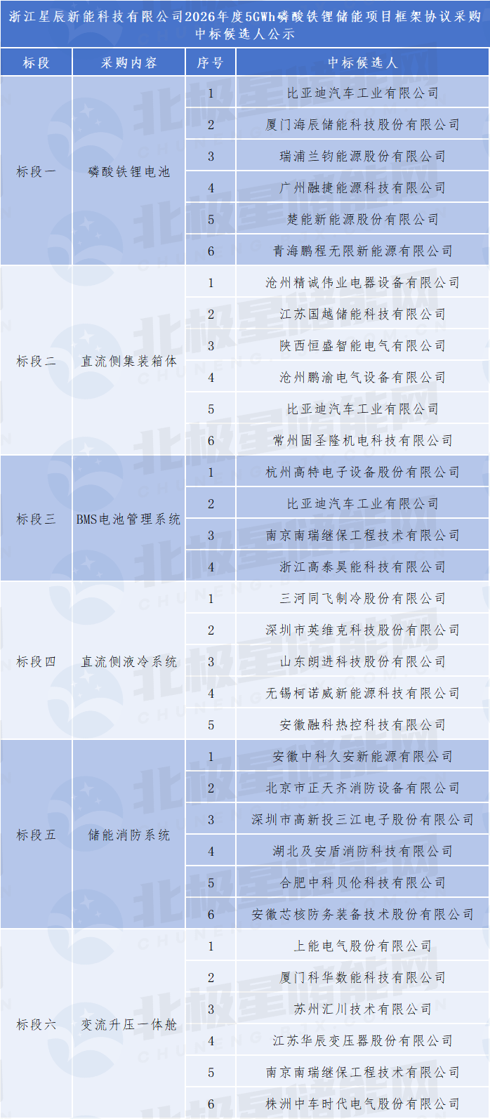 北极星储能网讯:2026年3月11日,浙江星辰新能科技有限公司2026年度5GWh储能项目框架协议采购中标候选人公示,六个标段共30家企业入围,其中比亚迪同时入围了磷酸铁锂电池、直流侧集装箱体、BMS三个标段,南瑞继保同时入围BMS、PCS两个标段。