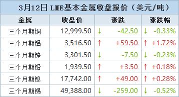 伦敦时间3月12日17:00(北京时间3月13日01:00),LME三个月期铝上涨59.5美元,或1.72%,收报每吨3,516.5美元。此前曾触及3,546.50美元,创2022年3月下旬以来新高。