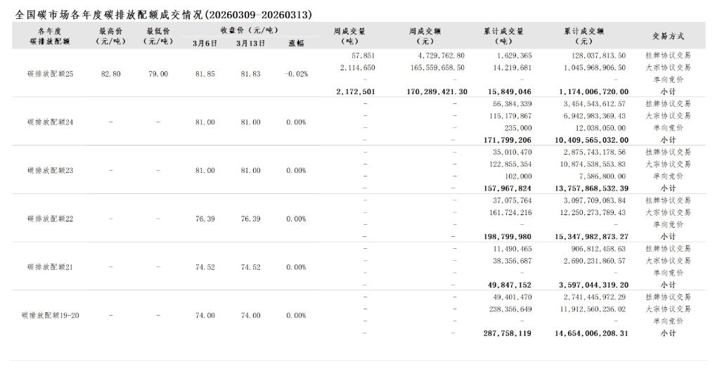 2026年1月1日至3月13日,全国碳市场碳排放配额成交量17,154,807吨,成交额1,277,855,453.60元。