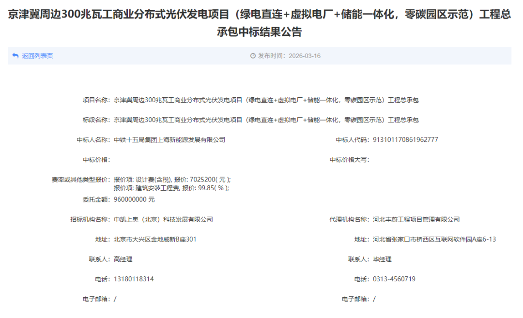 北极星储能网讯:2026年3月16日,京津冀周边300兆瓦工商业分布式光伏发电项目(绿电直连+虚拟电厂+储能一体化,零碳园区示范)工程总承包发布中标结果公告,中标人为中铁十五局集团上海新能源发展有限公司。
