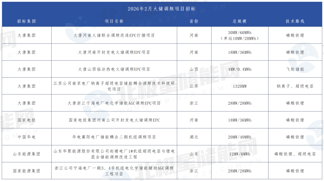 值得关注的是,2月共有5家能源集团发布9个火储调频项目招标,从招标数量上看,已占到当月储能招标项目总量的近十分之一。涉及储能技术类型包括、飞轮、钠离子、超级电容。