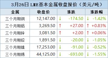 伦敦时间3月26日17:00(北京时间3月27日01:00),LME三个月期铜下跌174.5美元,或1.42%,收报每吨12,147.0美元。