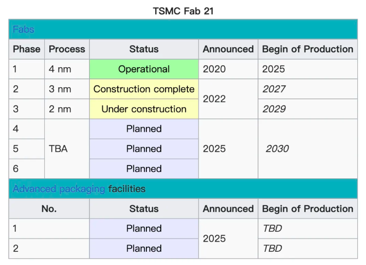 首个晶圆厂:采用 N4 工艺技术的大规模生产将于 2024 年第四季度开始。