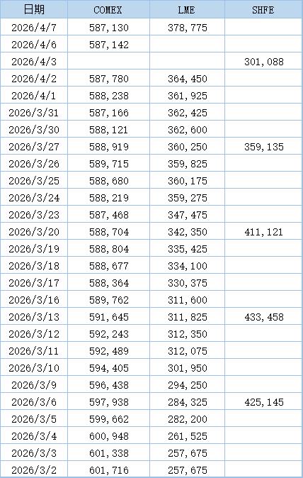 以下为2026年3月以来三大交易所铜库存数据:(单位:吨)